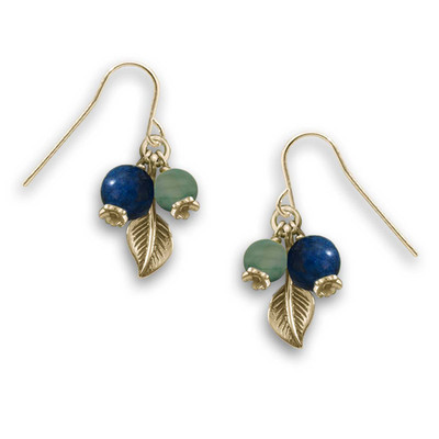 It's always blueberry season with these realistic earrings, which each hold a ripe matte finish genuine Lapis "blueberry", and a genuine moss green Agate unripe "blueberry". In 14k Gold with a light oxidized finish. 1 3/8" long x 5/8" wide, on fishhook earwires.