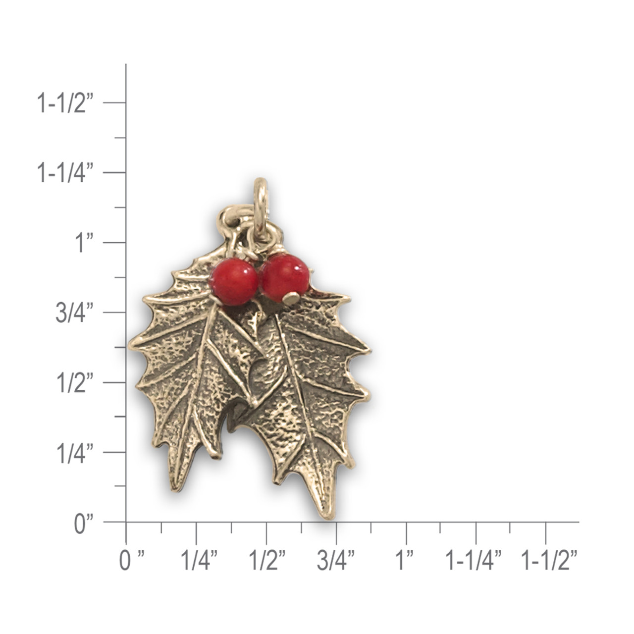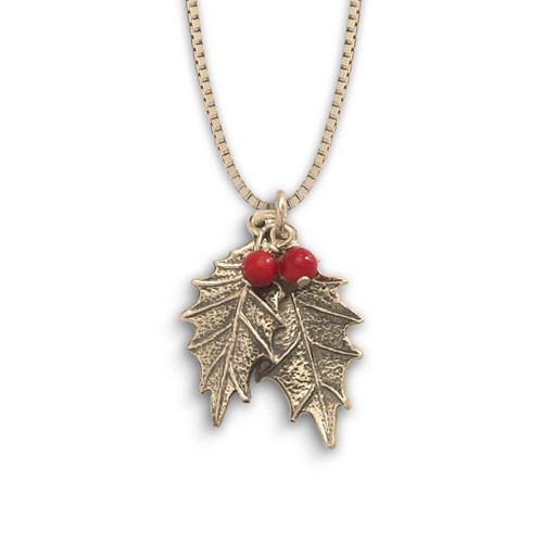 Holly is a symbol of eternal life and was hung in homes to bring good luck and protection. Our 14K Gold Holly Pendant has two intricate leaves with two "holly berries" made with genuine coral stones. Measures 3/4" long, 1 1/4" wide and 1/8" tall.
