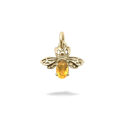 Our 14k Gold Queen Bee Charm is buzzing with beauty! Detailed wings with a hand set genuine faceted oval Citrine golden gemstone. 5/8" wide, 11/16" long including ring, and 3/16" deep.