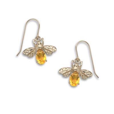 Our 14kt Gold Queen Bee earrings are buzzing with beauty! Detailed wings with hand set genuine faceted oval Citrine golden gemstones. 7/8" wide, 1" long and 1/4" deep.