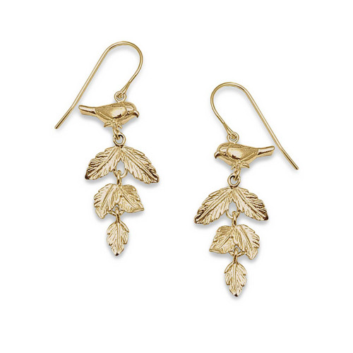 Our 14k Gold Summer Song Earrings feature a delicately crafted bird perched above graceful leaf charm dangles, offering timeless, nature-inspired elegance. Suspended from fish hooks, the earrings measure 1-3/4" length with fish hooks, 5/8" width, 3/16" depth.