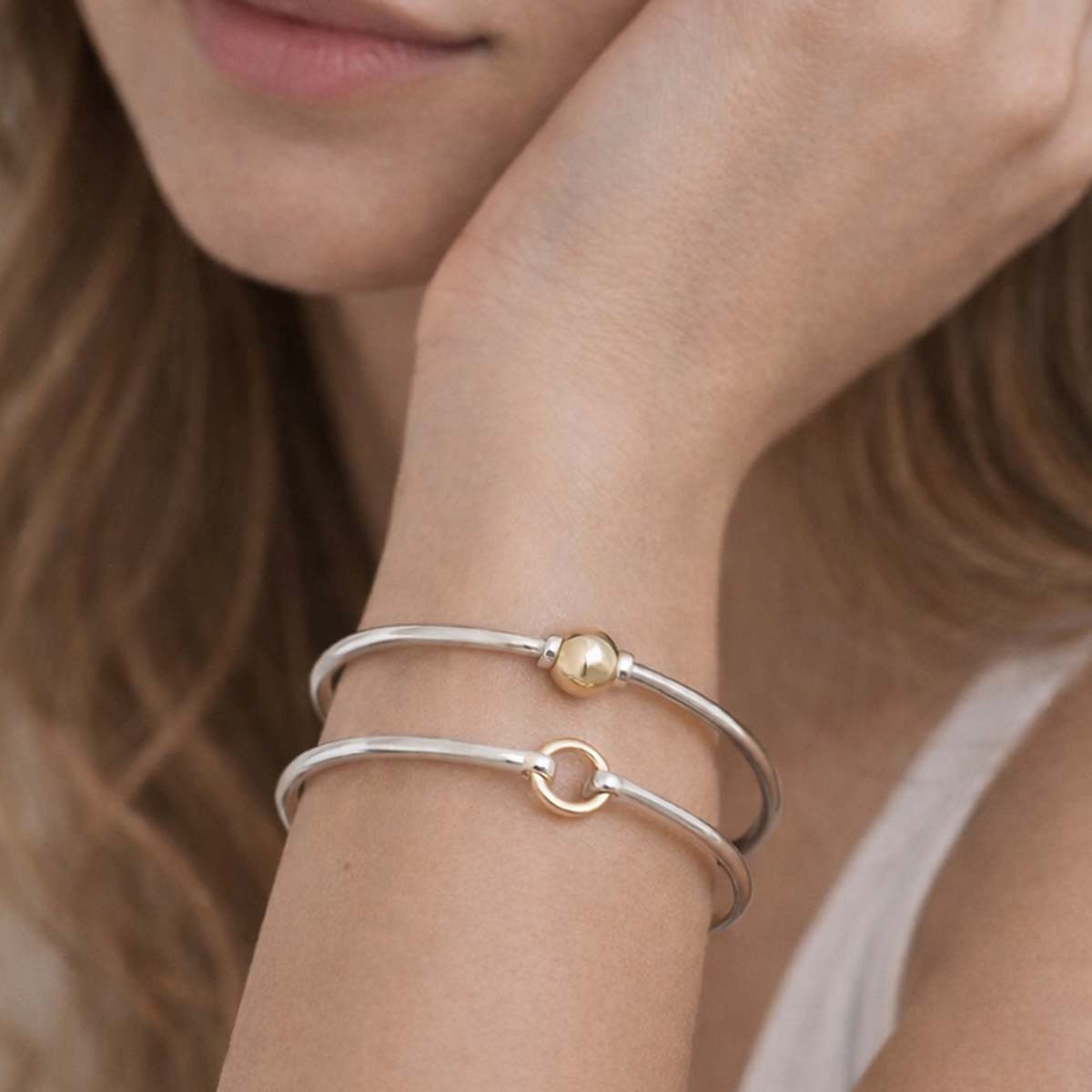 A classic bracelet to wear everyday, our Screw Clasp bracelet features a 14k Gold bead securely attached to a sleek bangle. Easily unscrew the bead to open and close the clasp. Bead measures 5/16". Available in sizes extra small, small, regular, large, and extra large. See photos for sizes of each.