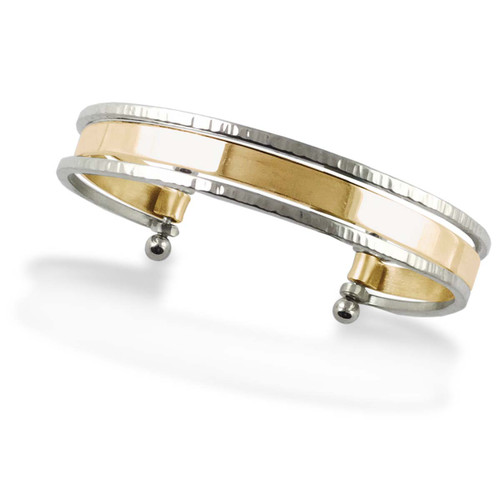 Our Sterling Silver and 14k Gold Stacked Cuff is made from 2 hand forged Sterling Silver bands that catch the light, with a smooth 14kt Gold center band nested between. An instant classic. 3/8" wide, 2-5/8" side to side diameter.