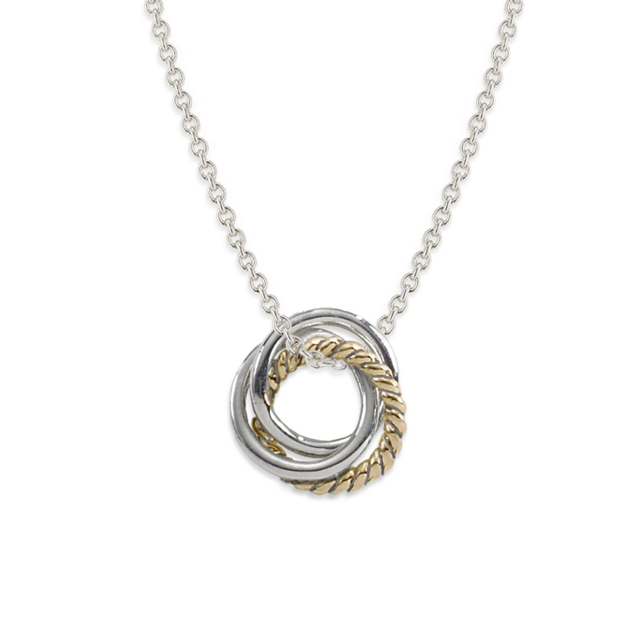 Our Sterling Silver and 14k Gold Triple Knot Pendant is made from 2 Sterling rings, and one 14k Gold ring that interlock and move freely. 11/16" diameter . Chain sold separately.