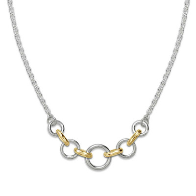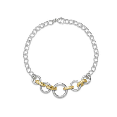 Our Ellery Links Bracelet is made of Sterling Silver graduated rings connected with handmade Sterling Silver hammered links. Bracelet is 8" length with lobster claw clasp that can be linked onto chain links for adjustability to fit any size wrist, ring section is 2 1/4" wide, center ring is 1/2" length & 3/16" depth.