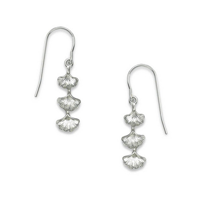 Our Sterling Silver Ginkgo Earrings are formed with 3 finely carved Ginkgo leaves that drop from the ear. The Ginkgo tree is the oldest surviving species of tree known to exist, with a botanical history spanning more than 200 million years. It is the perfect symbol of resilience and hope. High polish finish with antiquing that reveals the fine details of the carved leaves. Suspended from Sterling Silver fishhook earwires. 1 1/2" long, including earwires, 1/4" wide.
