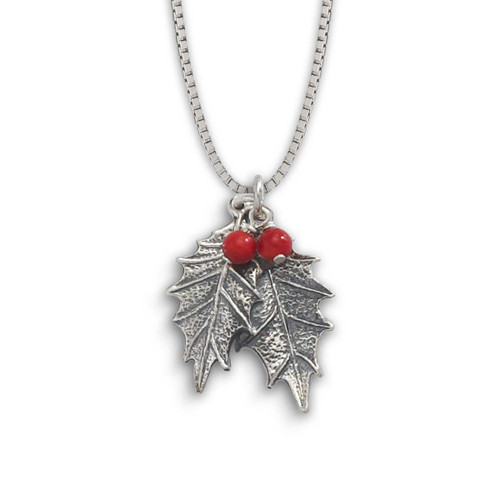 Holly is a symbol of eternal life and was hung in homes to bring good luck and protection. Our Sterling Silver Holly Pendant has two intricate leaves with two "holly berries" made with genuine coral stones. Measures 3/4" long, 1 1/4" wide and 1/8" tall.