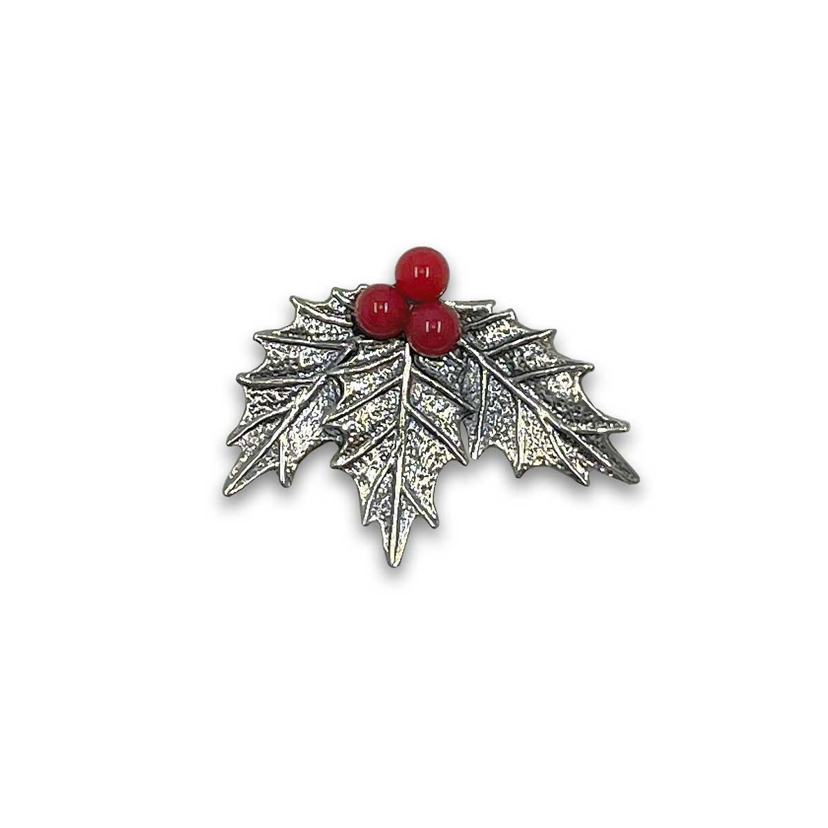 Holly is a symbol of eternal life and was hung in homes to bring good luck and protection. Our Sterling Silver Holly Pin has three intricate leaves with three "holly berries" made with genuine coral stones. Pin measures 15/16" long, 1 1/4" wide and 3/16" tall.