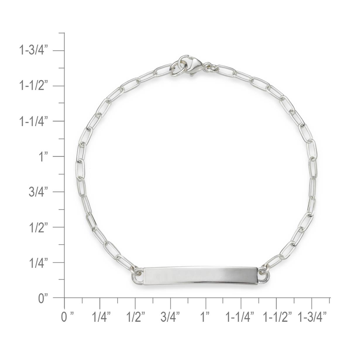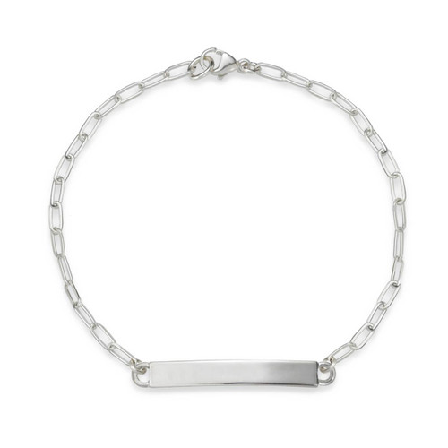 A modern classic chain style with an ID bar perfect for personalizing with a name, initials or a special date. Solid Sterling Silver, 2.6mm (approximately 1/8") wide links, elongated oval Paper Clip Chain with lobster claw closure. High polish finish. Choose your preferred length.