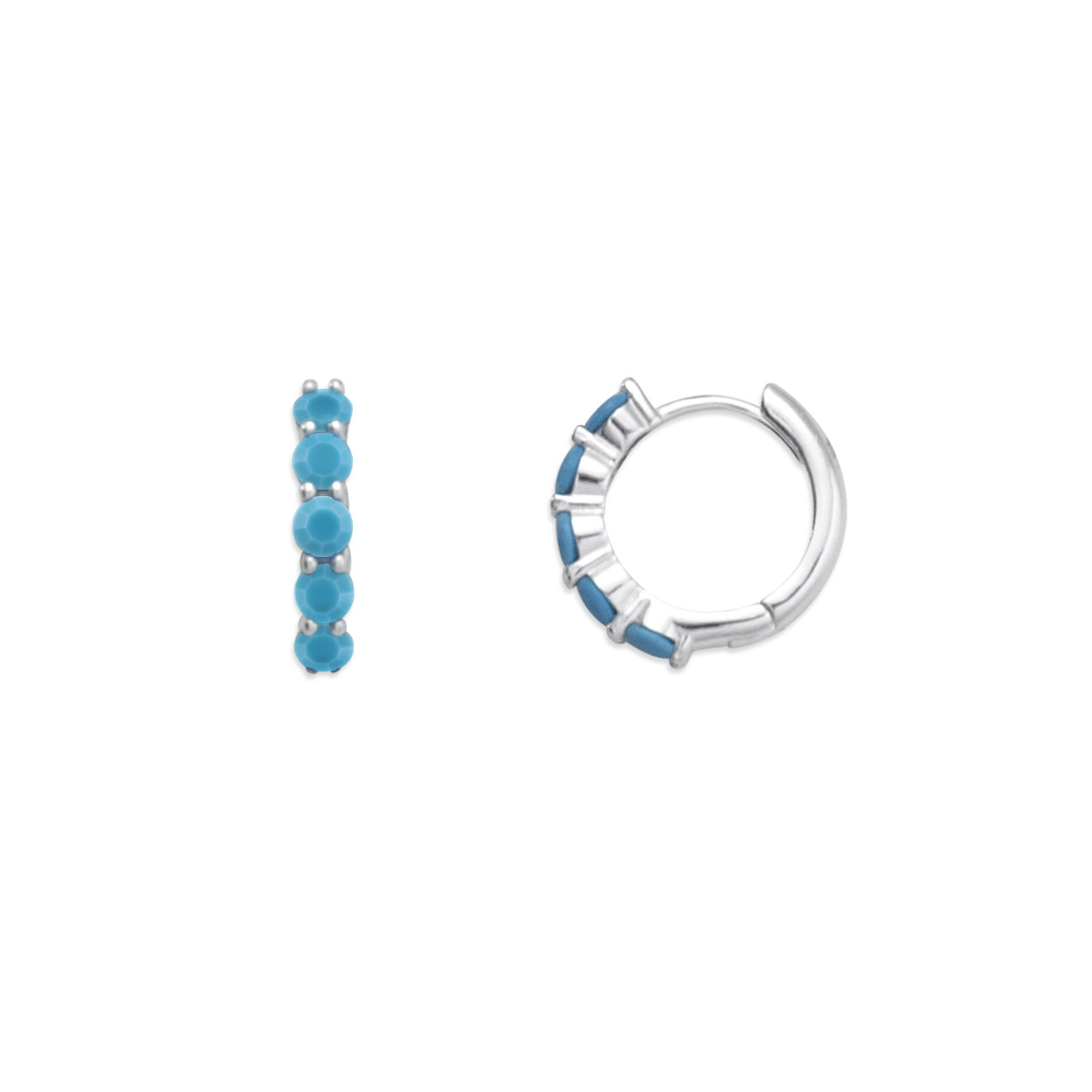 Our Sterling Silver Nano Turquoise Hoop Earrings bring modern elegance and radiant color to your collection. The beautiful blue Nano Turquoise are lab-created gemstones that are known for their vibrant, consistent color and durability, and are eco-friendly & ethically produced. Hoops are 5/8" diameter with secure huggie closure ensures all-day comfort.