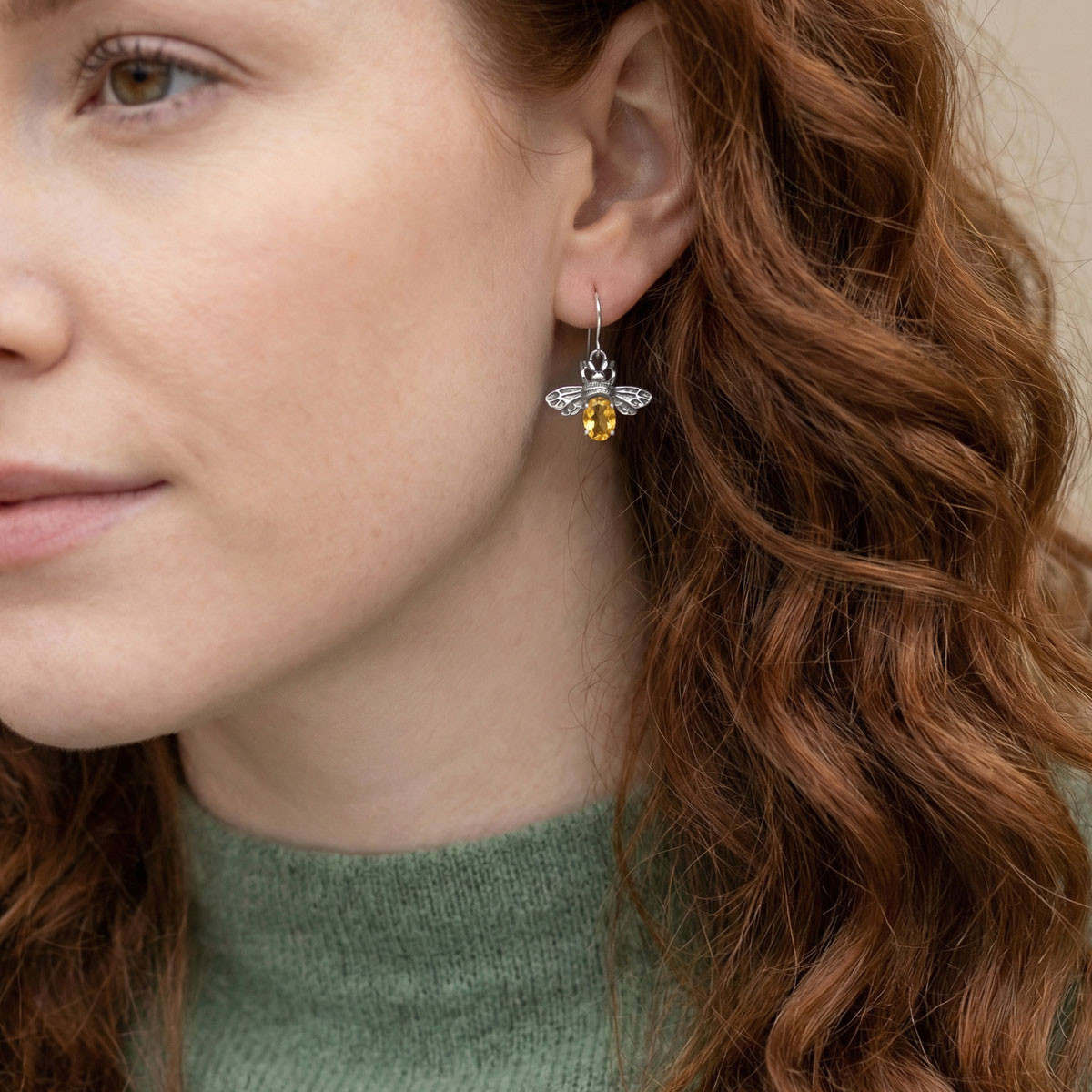 Our Sterling Silver Queen Bee earrings are buzzing with beauty! Detailed wings with hand set genuine faceted oval Citrine golden gemstones. 7/8" wide, 1" long and 1/4" deep.