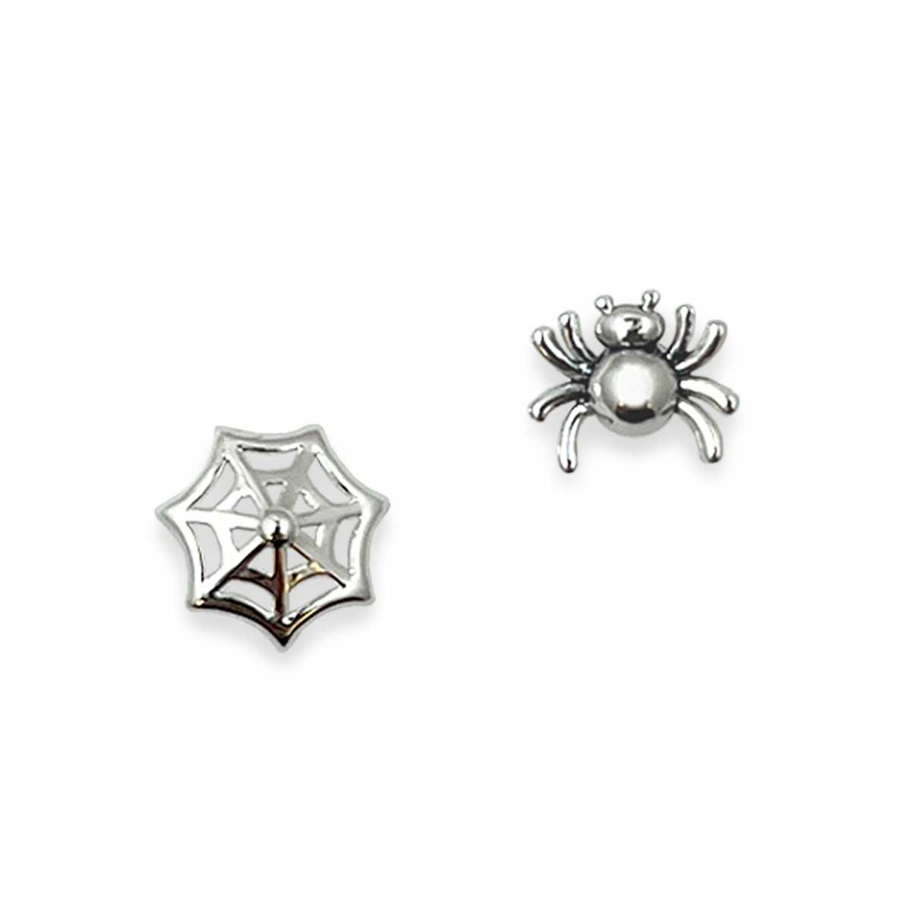Bring a playful twist to your jewelry collection with our Sterling Silver Spider & Web Earrings. Designed as a mismatched pair, one earring features a charming spider, while the other showcases its intricate web. Spider measure 3/8" length, 7/16" width, 1/8" depth. Web measures 7/16" length, 7/16" width, 3/16" depth.