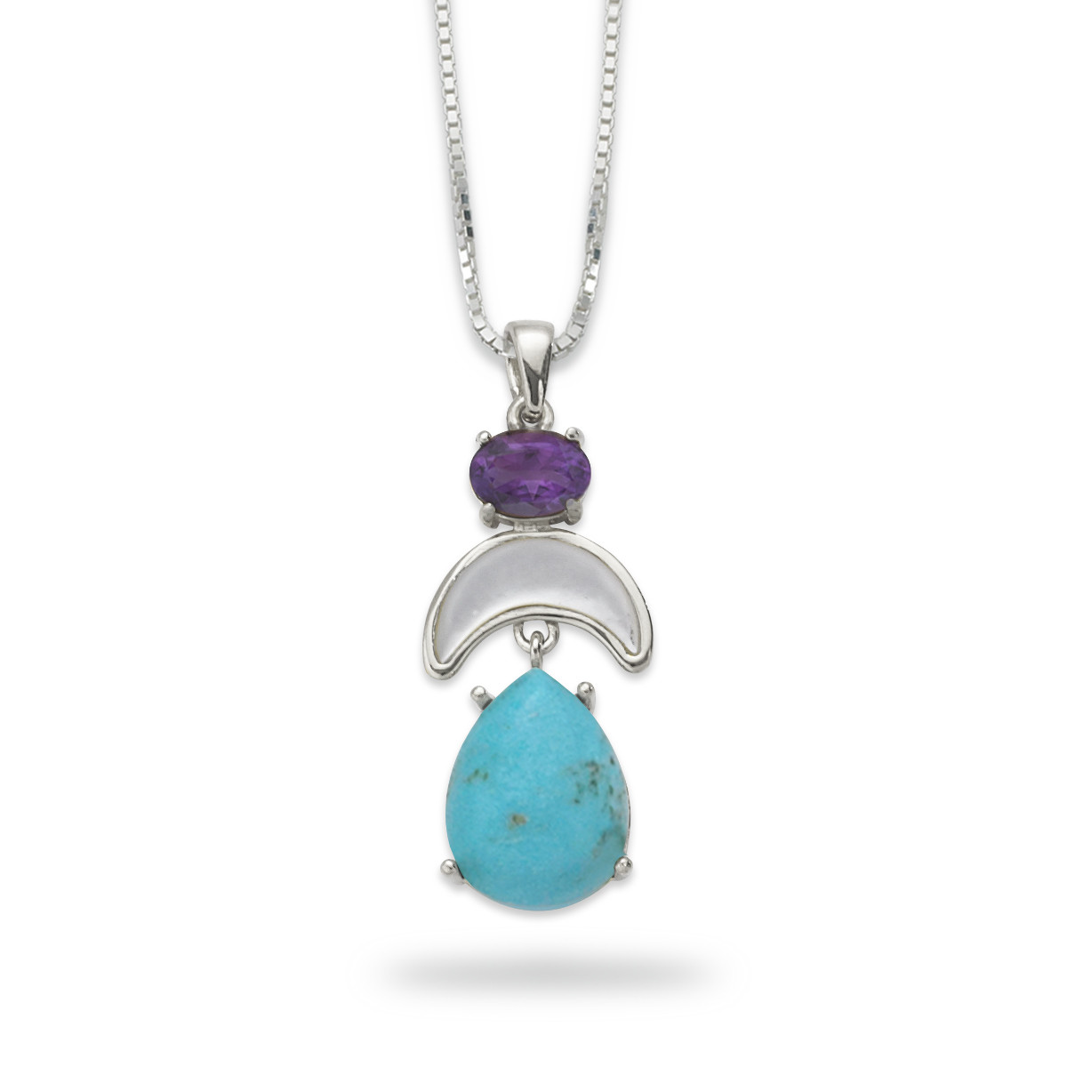 A stunning trio of natural stones - an oval genuine Amethyst, a crescent moon-shaped Mother of Pearl, and a pear-shaped Turquoise. Together, they create a captivating fusion of gemstones that celebrate harmony and individuality. Each stone is hand-set in Sterling Silver, highlighting each stone's natural beauty and unique shape. Pendant measures 1-5/8" length with bail, 5/8" width.