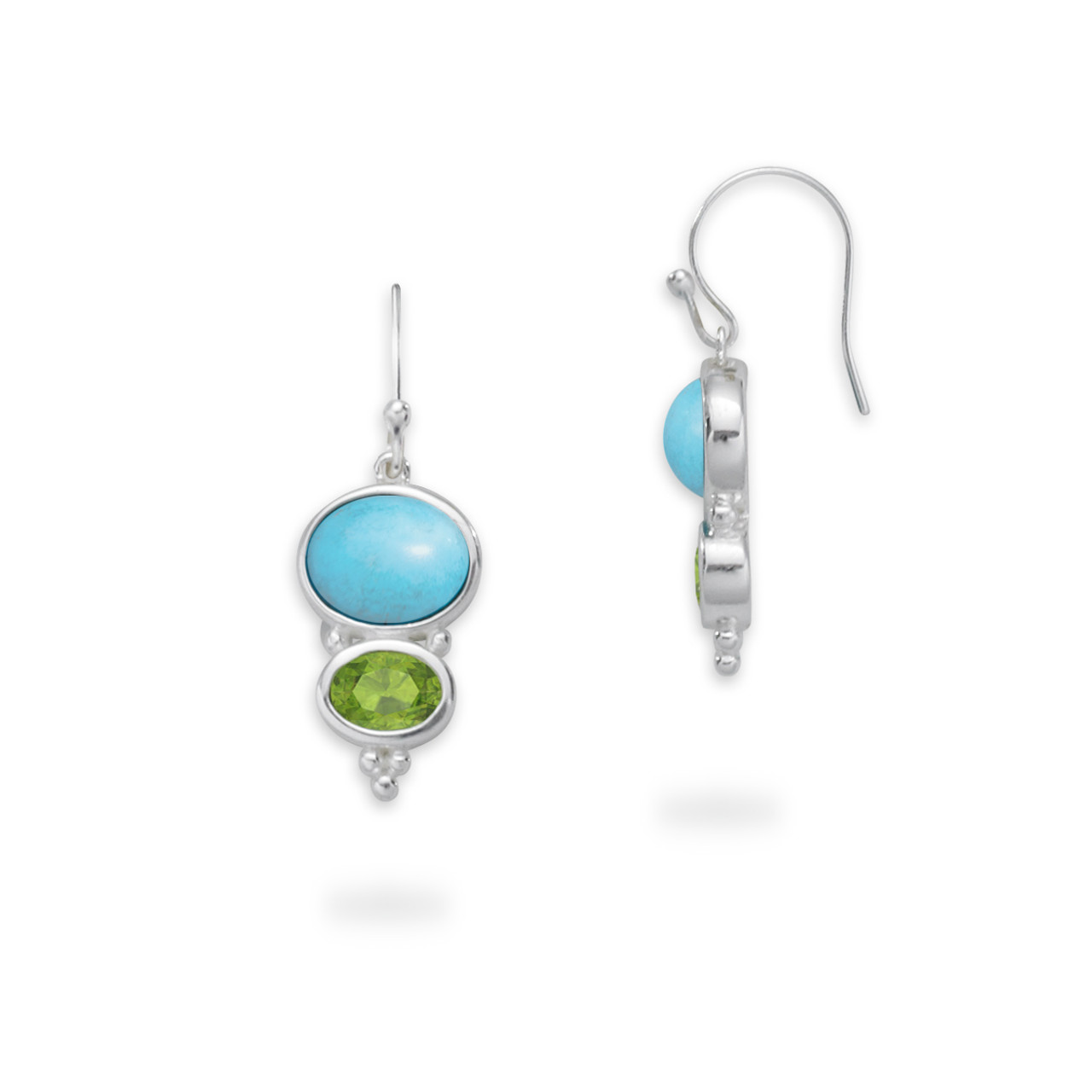 Add a pop of color to your everyday style with our Sterling Silver Turquoise & Peridot Earrings. The pairing of genuine oval Turquoise cabochons and genuine oval Peridot gemstones evokes the serenity of earth and sky, creating a harmonious balance of natural beauty and refined artistry. Earrings measure 1-3/8" length with fish hooks, 1/2" width.