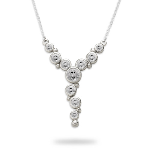 Delicate and playful, our Sterling Silver White Topaz Bubbles Necklace brings a touch of sparkle to every outfit. Featuring 5.25 carats total weight genuine White Topaz stones set in a cascading “bubble” design, each gem catches the light beautifully, creating a subtle shimmer that feels both modern and elegant. Measures 1-3/4" length, 1-1/4" width, in 18" length with 2" extender for a versatile fit.